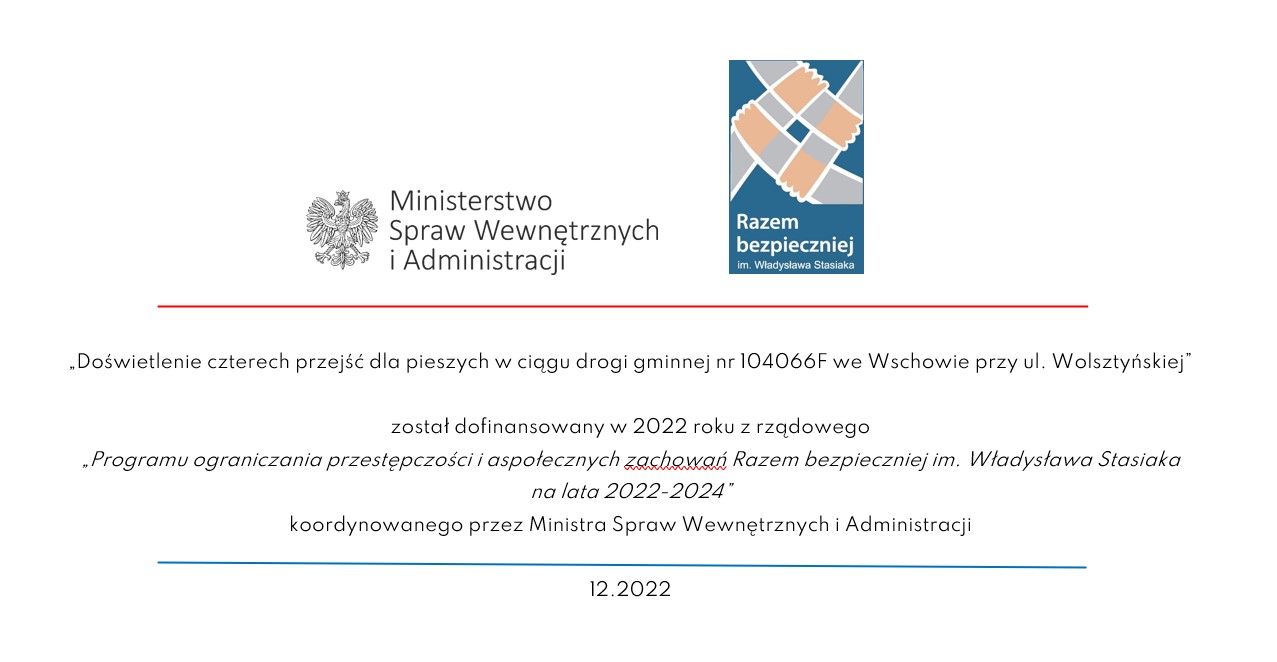 Zakończyła się realizacja zadania „Doświetlenie czterech przejść dla pieszych w ciągu drogi gminnej nr 104066F we Wschowie przy ul. Wolsztyńskiej” dofinansowanego z Rządowego Programu ograniczania przestępczości i aspołecznych zachowań Razem bezpieczniej im. Władysława Stasiaka na lata 2022-2024.