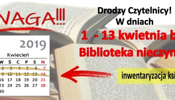 Informujemy, że w dniach 1-13 kwietnia 2019 r., z powodu inwentaryzacji księgozbioru, Biblioteka Publiczna Miasta i Gminy we Wschowie będzie nieczynna. W związku z tym prosimy o wcześniejsze zaopatrzenie się w odpowiednią ilość książek do czytania i...