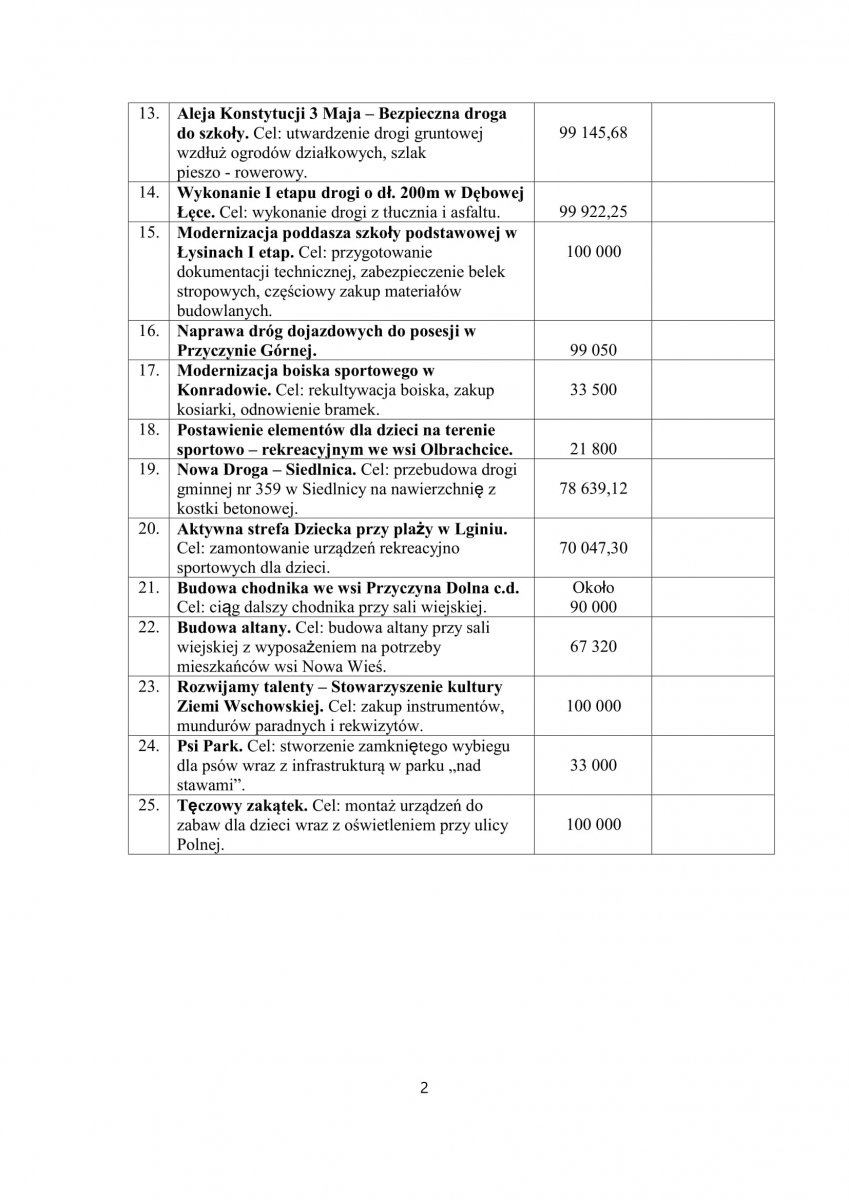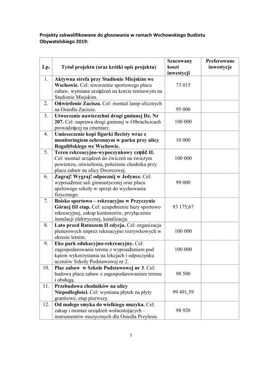 Aby zagłosować trzeba będzie mieć ze sobą dokument tożsamości. Konieczne będzie wypełnienie dodatkowej karty z numerem PESEL. Jest to jedyna metoda chroniąca przed kilkakrotnym głosowaniem przez jedną osobę. Do głosowania uprawnione są osoby, które w dniu głosowania ukończyły minimum 16 lat. Każdy z głosujących może oddać głos maksymalnie na trzy projekty. O zwycięstwie decyduje liczba głosów oddanych na dany projekt. Do realizacji zadań w roku przyszłym zostanie zakwalifikowane minimum sześć projektów - bierze się to stąd, że rokrocznie do tej pory na realizację władze gminy przekazywały 600 tysięcy złotych. Przy założeniu, że nie można wydatkować na jeden projekt więcej niż sto tysięcy złotych, mówimy o minimum sześciu projektach, a nie każdy z projektów ma w założeniu wysokość maksymalnej dopuszczalnej kwoty. Jest zatem o co walczyć, bo liczba realizacji po trzech latach przedstawianych na naszych łamach robi wrażenie. Poniżej lista projektów w kolejności zgodnej z kartą do głosowania, krótki opis i miejsce realizacji gdy nie wynika to z tytułu i koszt realizacji. Udanych wyborów!