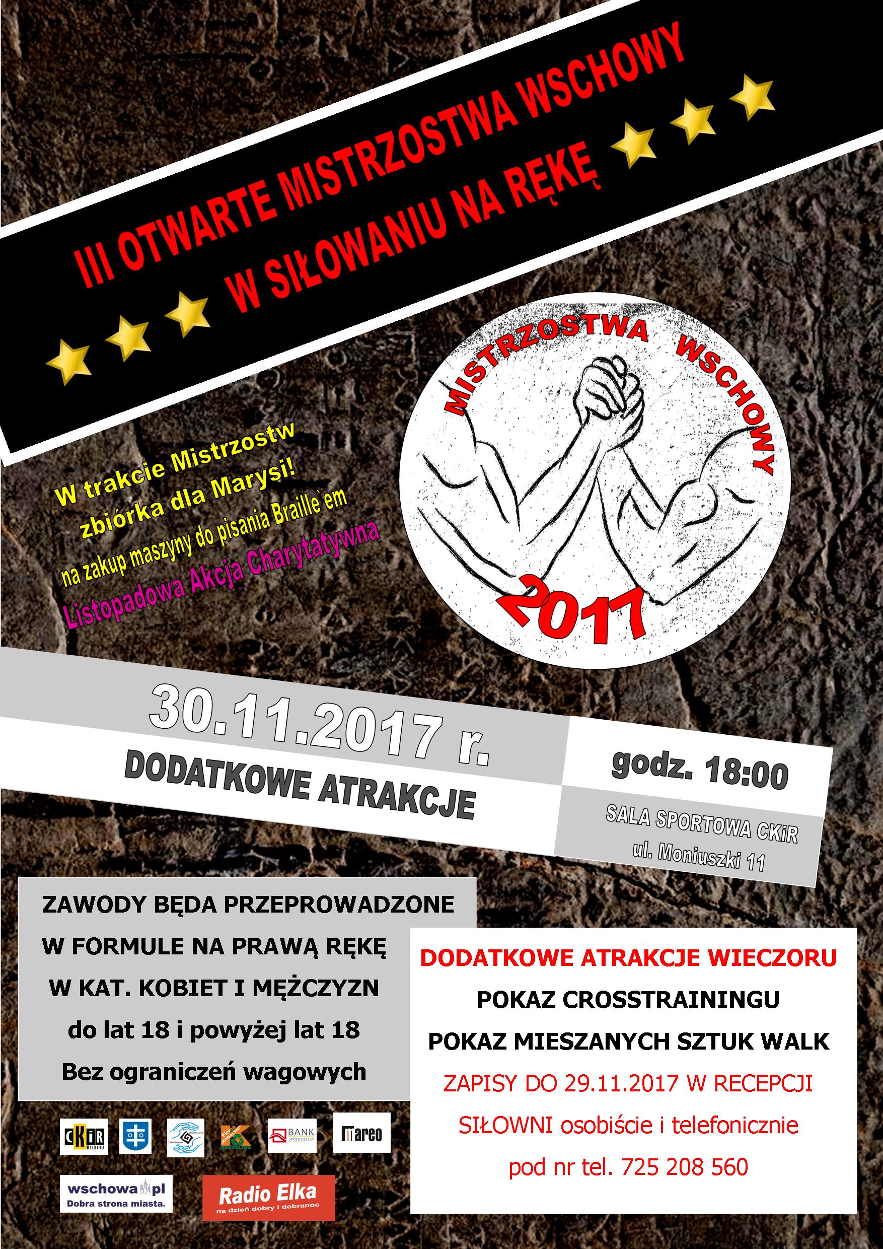 Zapraszamy wszystkich miłośników siłowania na rękę na III Otwarte Mistrzostwa Wschowy. Zawody odbędą się 30 listopada o godzinie 18:00 w sali sportowej CKiR przy ul. Moniuszki 11. Zawody będą przeprowadzone w formule na prawą rękę w kategorii kobiet i mężczyzn do lat 18 i powyżej lat 18 bez ograniczeń wagowych. Zapisy do 29.11.2017 r. w recepcji siłowni osobiście lub telefonicznie pod nr telefonu 725 208 560.