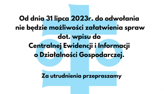 Od dnia 31 lipca 2023r. do odwołania w UMiG Wschowa nie będzie możliwości załatwienia spraw dot. wpisu do Centralnej Ewidencji i Informacji o Działalności Gospodarczej.
