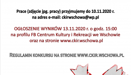 Centrum Kultury i Rekreacji zaprasza do udziału w KONKURSIE PLASTYCZNYM ONLINE W ROCZNICĘ ODZYSKANIA PRZEZ POLSKĘ NIEPODLEGŁOŚCI Konkurs skierowany do dzieci i młodzieży w wieku od 7 do 16 lat. Konkurs ma na celu: popularyzację wiedzy o odzyskaniu przez Polskę Niepodległości, rozbudzanie postaw patriotycznych poprzez rozwijanie wyobraźni plastycznej,przybliżenie piękna i bogactwa ziemi ojczystej.