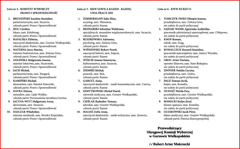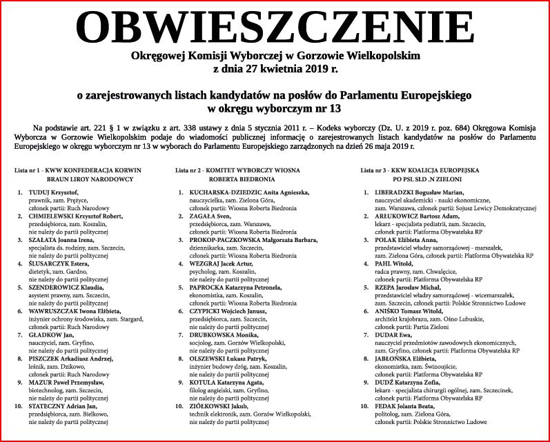 W najbliższą niedzielę od godziny 7.00 do godziny 21.00 odbędzie się głosowanie w wyborach posłów do Parlamentu Europejskiego. W okręgu 13 złożonym z mieszkańców województw lubuskiego i zachodniopomorskiego zarejestrowano sześć list kandydatów, po 10 nazwisk na każdej z nich. Poniżej prezentujemy Obwieszczenie Okręgowej Komisji Wyborczej w Gorzowie Wielkopolskim z dnia 27 kwietnia 2019 r. o zarejestrowanych listach kandydatów na posłów do Parlamentu Europejskiego w okręgu wyborczym nr 13. Pod obwieszczeniem odnajdą państwo także materiał wideo przygotowany przez Państwową Komisję Wyborczą dotyczący poprawnego oddania głosu. Przypominamy, że aby oddać głos ważny należy na karcie do głosowania postawić znak X przy nazwisku tylko jednego kandydata.
