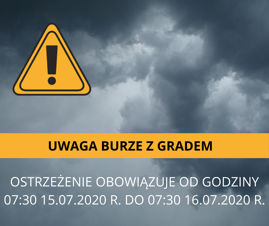Prognozuje się wystąpienie burz z opadami deszczu do 20 mm oraz porywami wiatru do 70 km/h. Możliwy grad.Ostrzeżenie obowiązuje od 15.07.2020 r. od godziny 07:30 do 16.07.2020 r. do godziny 07:30.