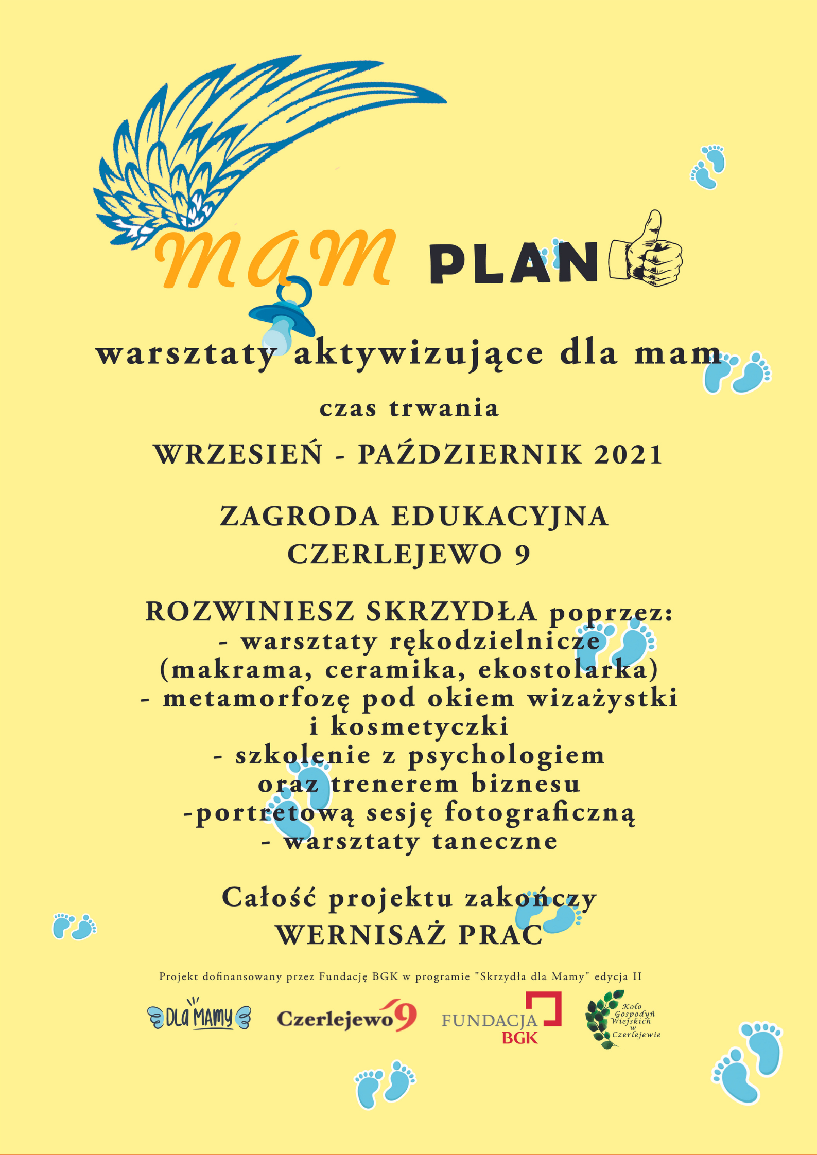 MAM Plan to aktywizujące warsztaty dla mam, które przebywają na urlopach macierzyńskich, rodzicielskich, wychowawczych. Będą miały możliwość odkrycia swoich talentów, zwiększenia kompetencji zawodowych i nabrania wiary w siebie, tak aby znów mogły powrócić do aktywności zawodowej. Cykliczne, warsztaty rękodzielnicze, spotkania z psychologiem, trenerem biznesu, wizażystą pozwolą mamom znów rozwinąć skrzydła. Warsztaty i forma spotkań w Zagrodzie Edukacyjnej Czerlejewo 9 pozwoli mamom przejść metamorfozę nie tylko wizualna ale przede wszystkim w postrzeganiu własnych możliwości do realizacji celów zawodowych i osobistych.
